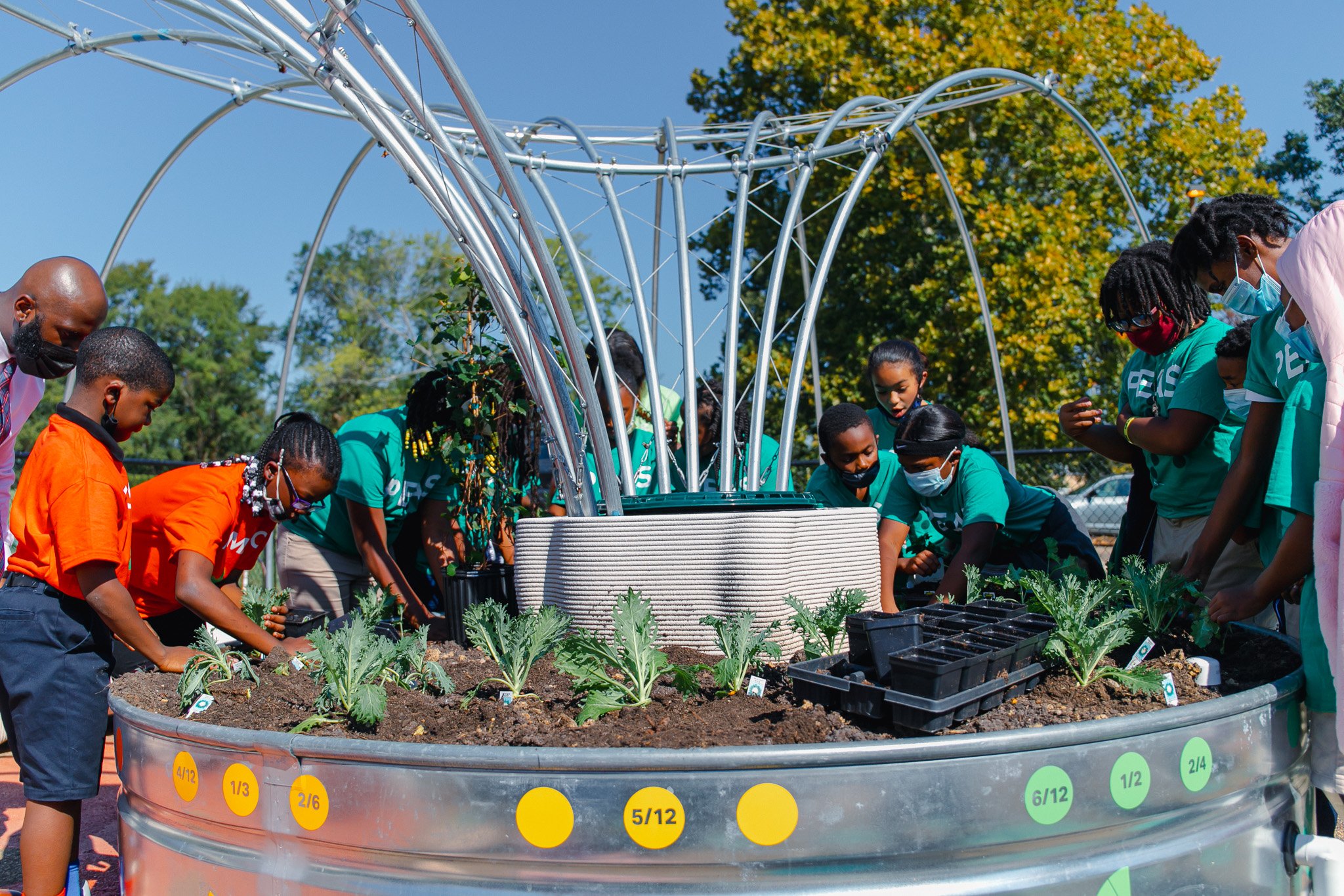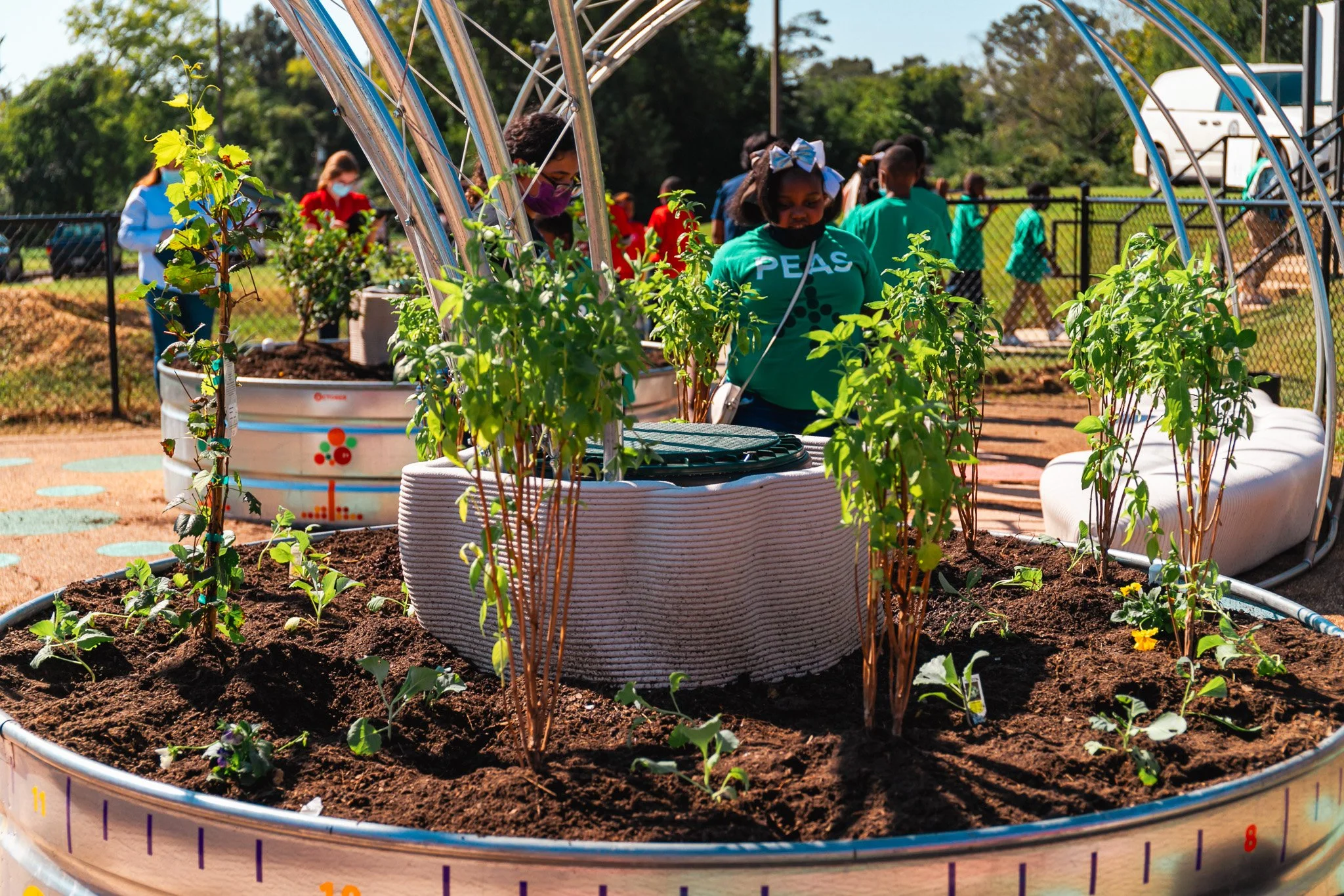 The LivingRoom learning garden at Galloway Elementary School was created as an outdoor classroom focused on health, food, and nutrition education. Developed as part of the Fertile Ground Project, the garden provides students with hands-on opportunities to learn where food comes from and how it is grown, a meaningful experience in communities impacted by food insecurity.