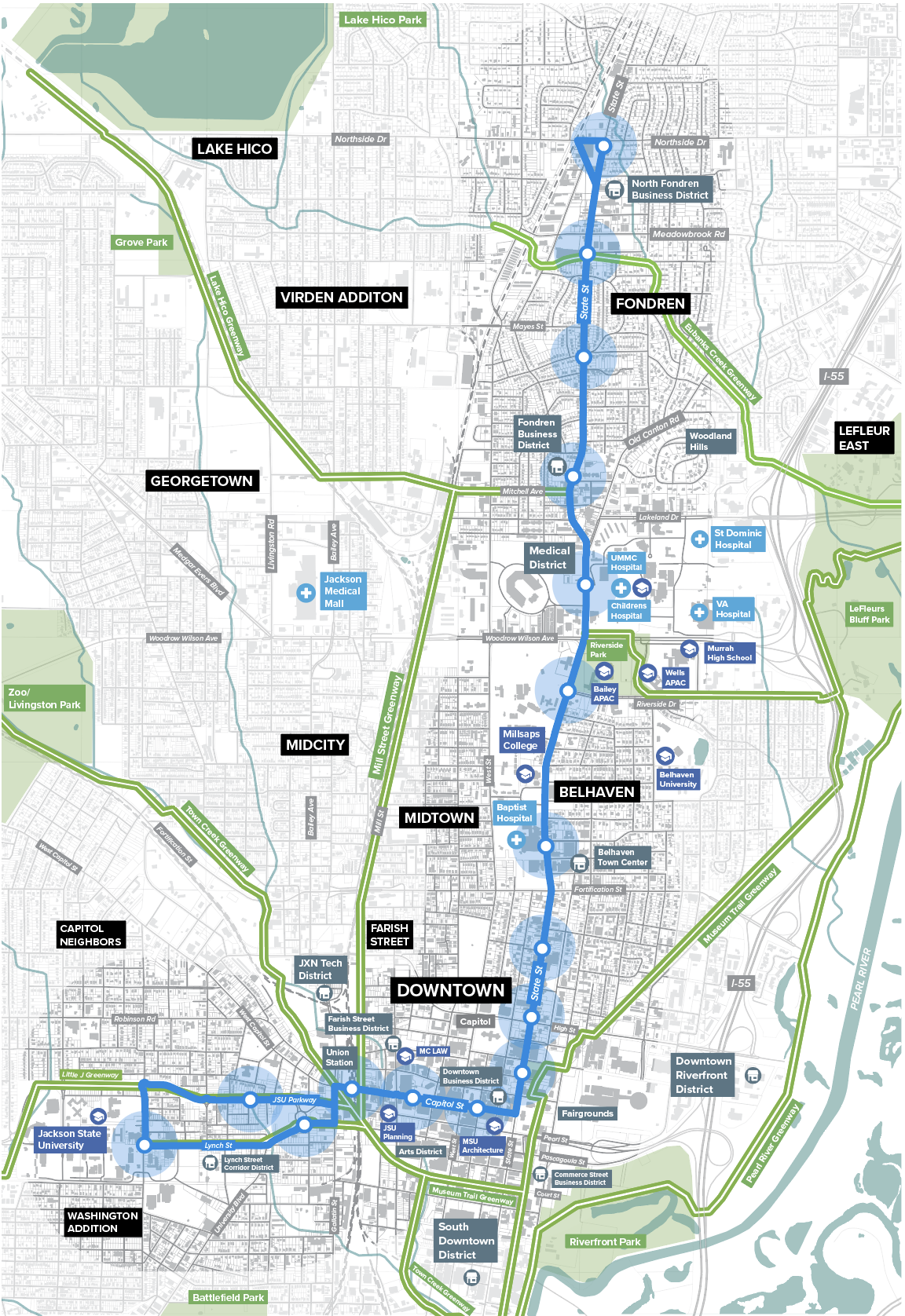 The ONELINE Corridor Development concentrates transit, housing, business activity, and economic development along a five-mile corridor through the center of the city from the Fondren District to Jackson State University. Key catalyst sites include the Medical District, Eubanks Creek, Riverside Park, and South Downtown. The overall project directly influences a 20 square mile area that contains the highest concentration of employment in Mississippi.